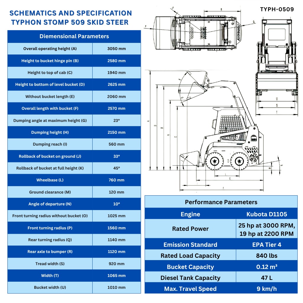 The TYPHON STOMP 509 is small in stature, but a giant in performance. This 3100 lbs skid-steer loader is small enough to get in tight spots, yet strong enough to get any job done. This agile little workhorse is the ideal size for scooting through narrow doorways, corridors, small paths and gates, and for working under low ceilings. It’s the perfect loader whenever the job is too big for a shovel or the space is too small for a larger machine.Behind the controls, you’ll effectively complete demanding work where other machines struggle or can’t go.